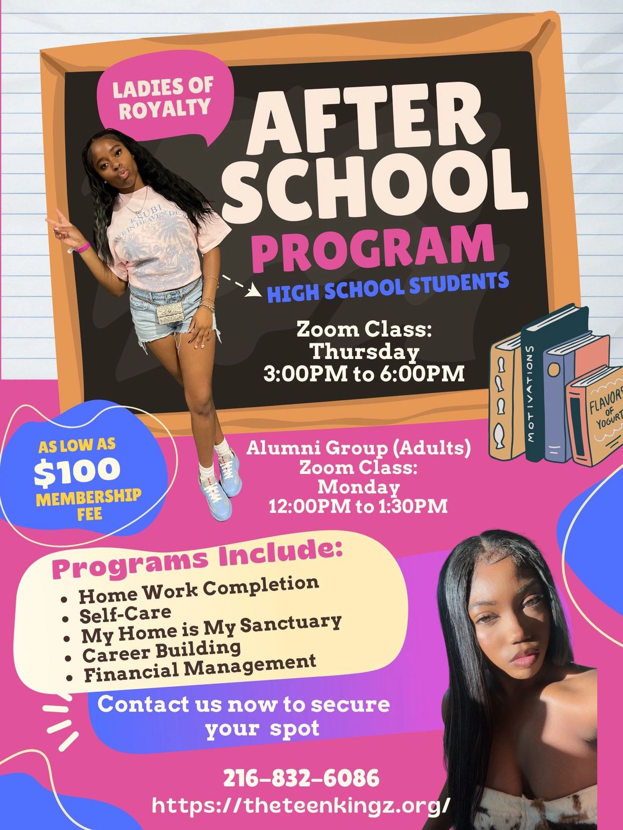 The mission of Ladies of Royalty is to empower teenage young women by nurturing their confidence, strengthening their character, and equipping them with essential life skills in self-care, home life, career development, and financial responsibility. We create a supportive and uplifting environment where every young woman can grow, heal, and step boldly into her purpose with dignity and self-worth.guided discussions, participants learn the importance of nurturing their mental, emotional, and physical well-being, creating a peaceful and respectful home environment, setting and pursuing meaningful career goals, and developing smart money management skills. Ladies of Royalty empowers young women to embrace their worth, walk with confidence, and lead with purpose in every area of life. Customized learning plan that meets their unique needs.
